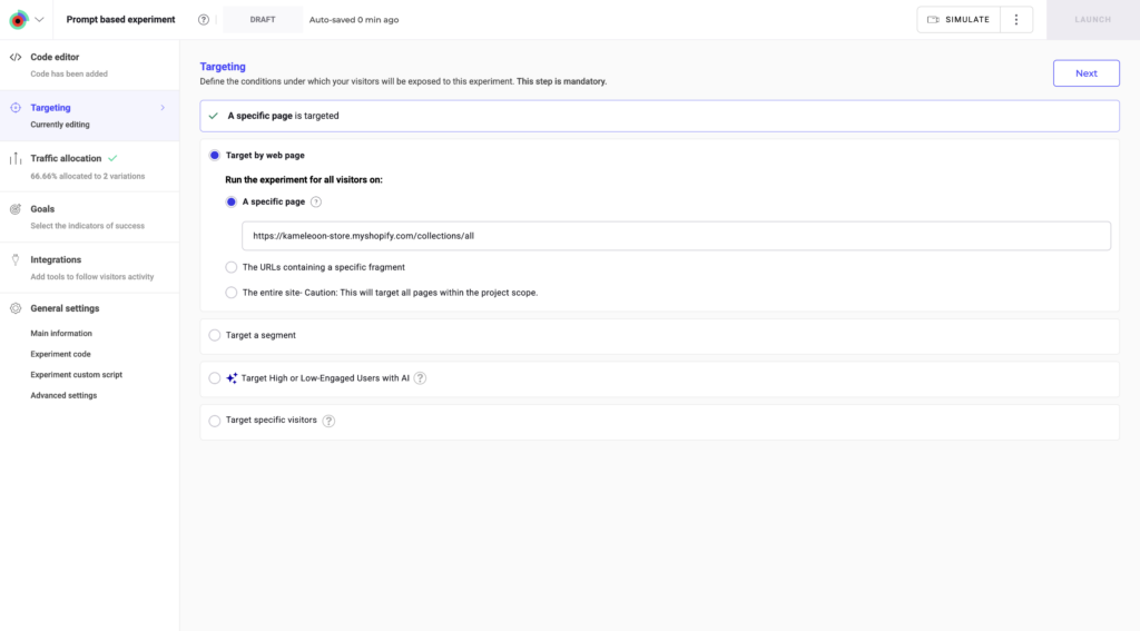 Une fois validé, le test se lance comme un test classique, avec définition des cibles, KPIs et répartition du trafic.